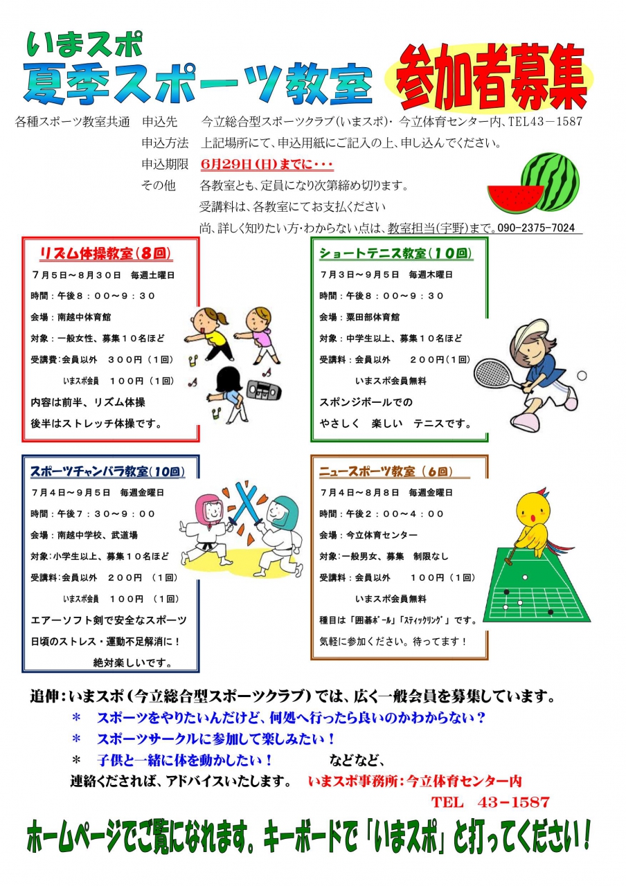 こんにちは!いまスポです。7月からスポーツ教室が始まります。今回は次の4教室です。☆リズム体操教室☆ショートテニス教室☆スポーツチャンバラ教室☆ニュースポーツ教室いい汗かいてみませんか!拡大版はこちら夏季スポーツ教室受講申込書.pdf
